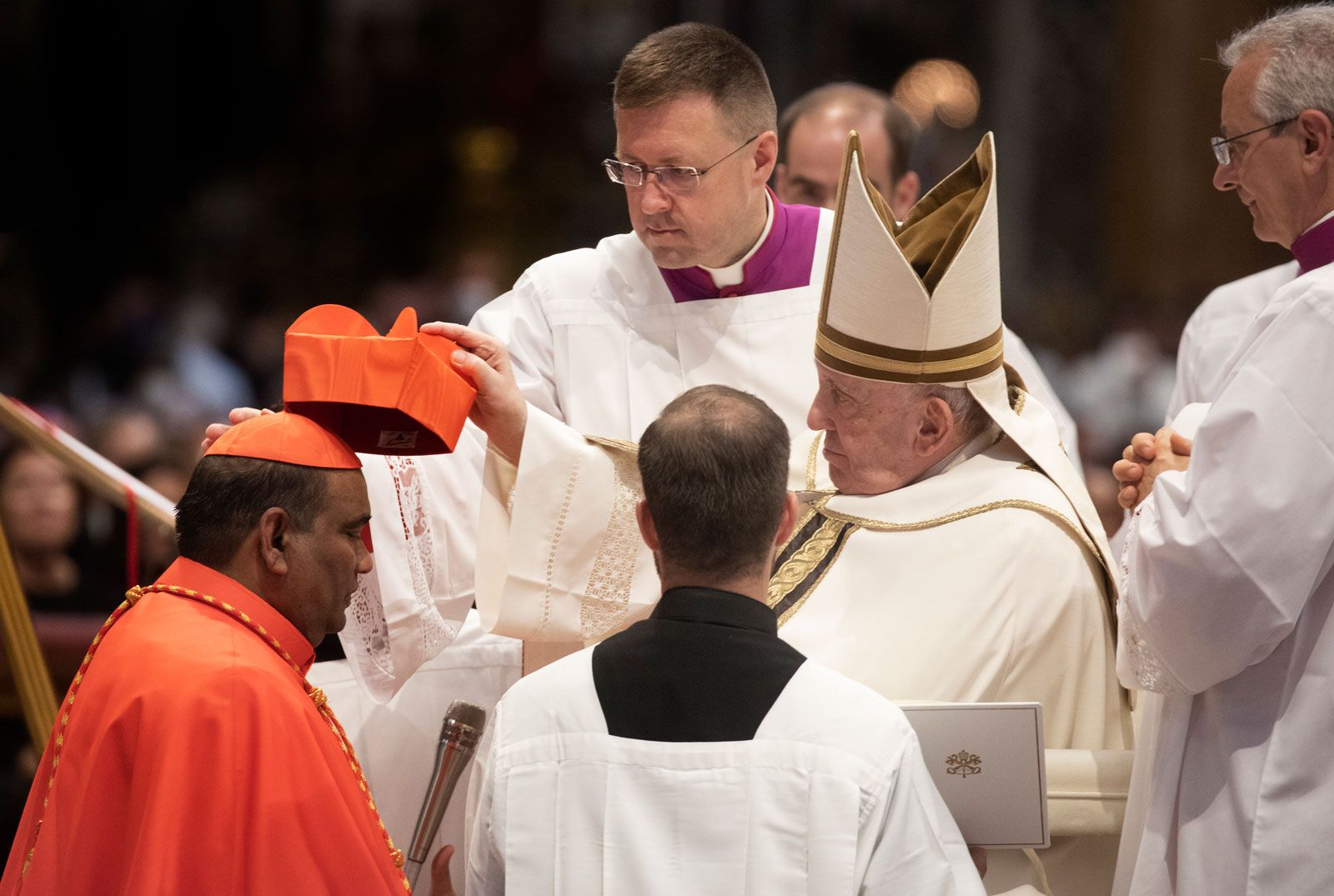 Choir dress is accompanied by a zucchetto. Bishops, including cardinals, archbishops, and the pope, may wear a zucchetto during mass but must remove it during the liturgy of the Eucharist. Cardinals may also wear a biretta—a square hat with four rounded ridges—over the zucchetto during certain processions or while giving absolution. The biretta draws attention to the moments in which it is removed, such as when standing near the altar, during the procession of the Eucharist, or whenever the name of Jesus is spoken.