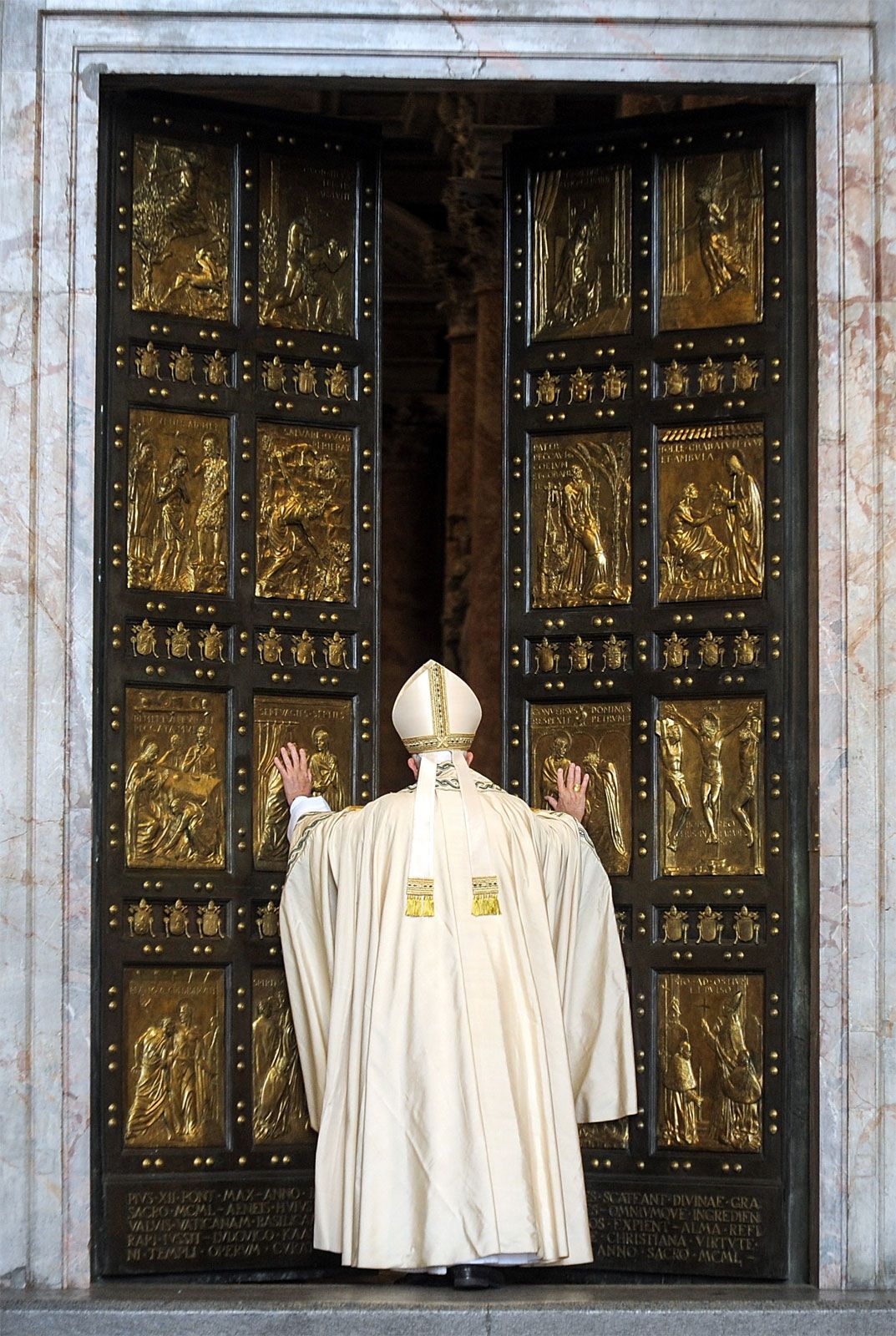 The pope and certain archbishops and bishops wear a distinctive white pallium over the chasuble as a symbol of full episcopal authority. It is made of a circular strip of lamb’s wool about 2 inches (5 cm) wide and is placed over the shoulders. Six crosses, one each on the chest and back and on each shoulder and band, adorn the vestment.